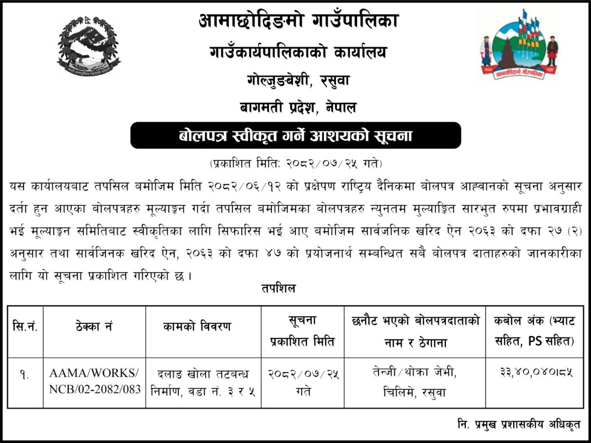 बोलपत्र स्वीकृत गर्ने आशयको सूचना ।